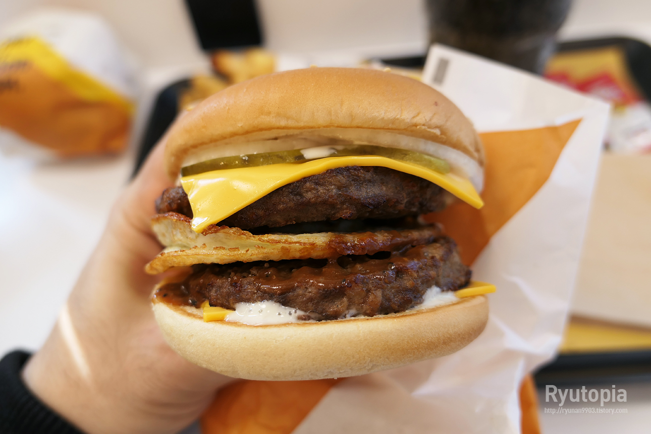 두꺼운 고기 패티 두 장에 치즈, 그리고 그 사이 계란후라이까지 들어있어 그야말로 진짜 고기 좋아하는 사람들을 위한