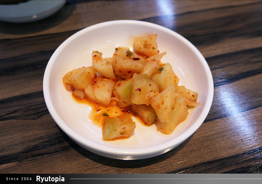 테이블에 깍두기가 담긴 작은 항아리가 비치되어 있어 반찬은 원하는 만큼 직접 담아먹으면 됩니다.