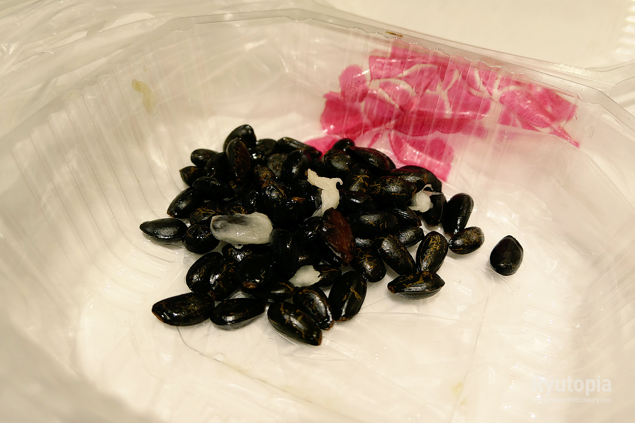씨앗 절대 씹어먹으면 안 되는게, 저게 생각 이상으로 엄청 단단해서 무리해서 씹다가 이 상할 수 있으니 무조건 조심!