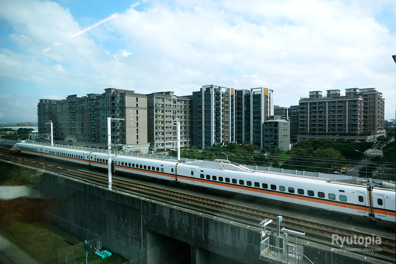 창 너머로 타이완 고속철도 700계 한 대가 지나가는 모습이 보인다.