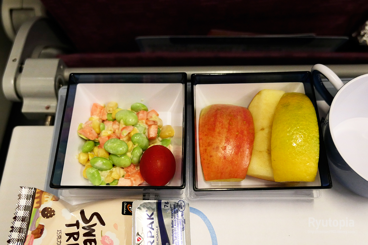 콩 샐러드와 함께 과일로는 오렌지와 사과가 제공된다.