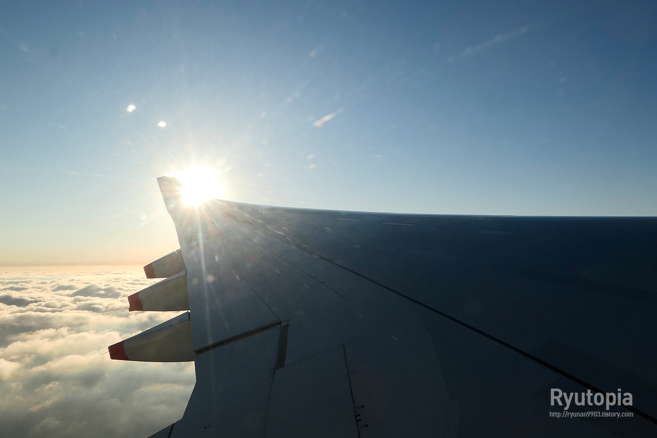 아쉽게도 날개 부분에 자리를 잡아 완벽한 풍경을 볼 순 없었고 저렇게 날개에 가려진 반쪽짜리 풍경만...