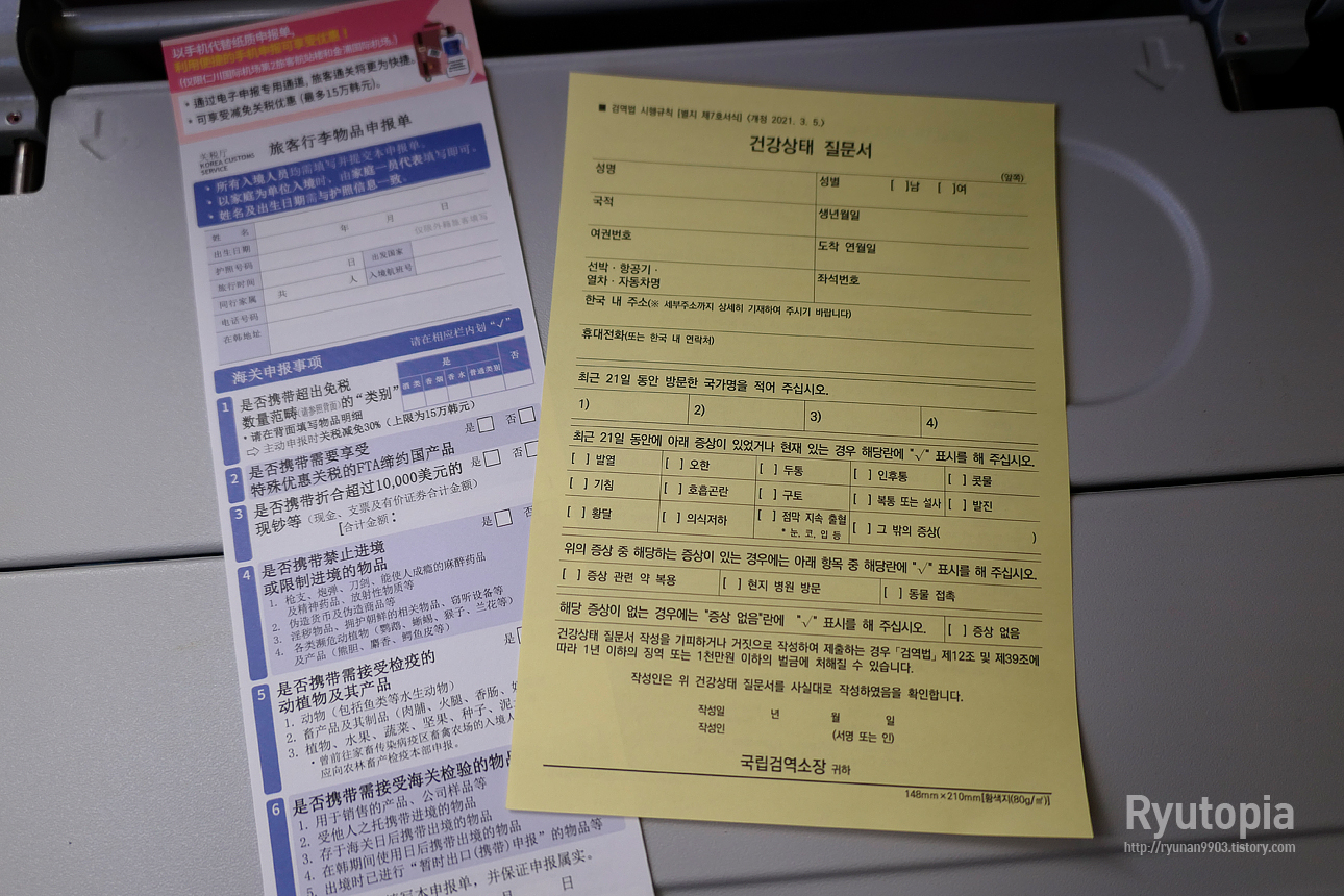 면세품 신고서와 함께 받은 건강상태 질문서.
