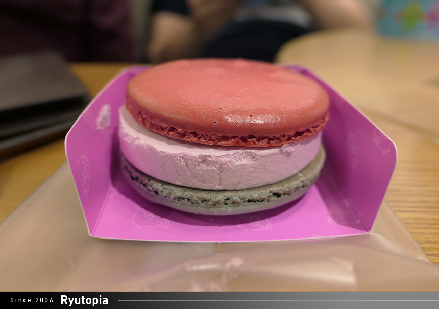 빨간 색과 녹색 마카롱 사이에 보라색 아이스크림이 두껍게 샌드되어 있는 형태.