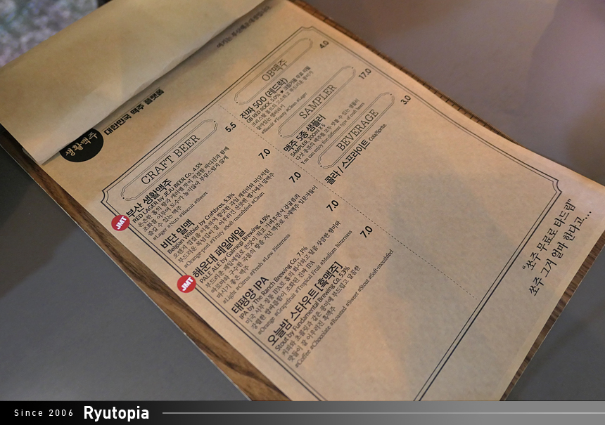 맥주는 크래프트 비어와 레드락, 그리고 다섯 종류의 크래프트 비어를 전부 맛볼 수 있는 샘플러가 있습니다.