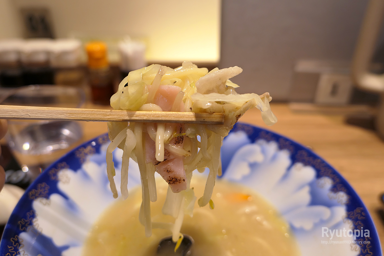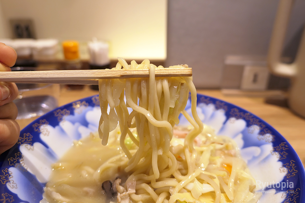 한국식 짬뽕면을 생각하기 쉽지만 그와 상당히 다르고 일본 라멘과도 다른 짬뽕면 특유의 식감이 담겨 있어 개성적인데