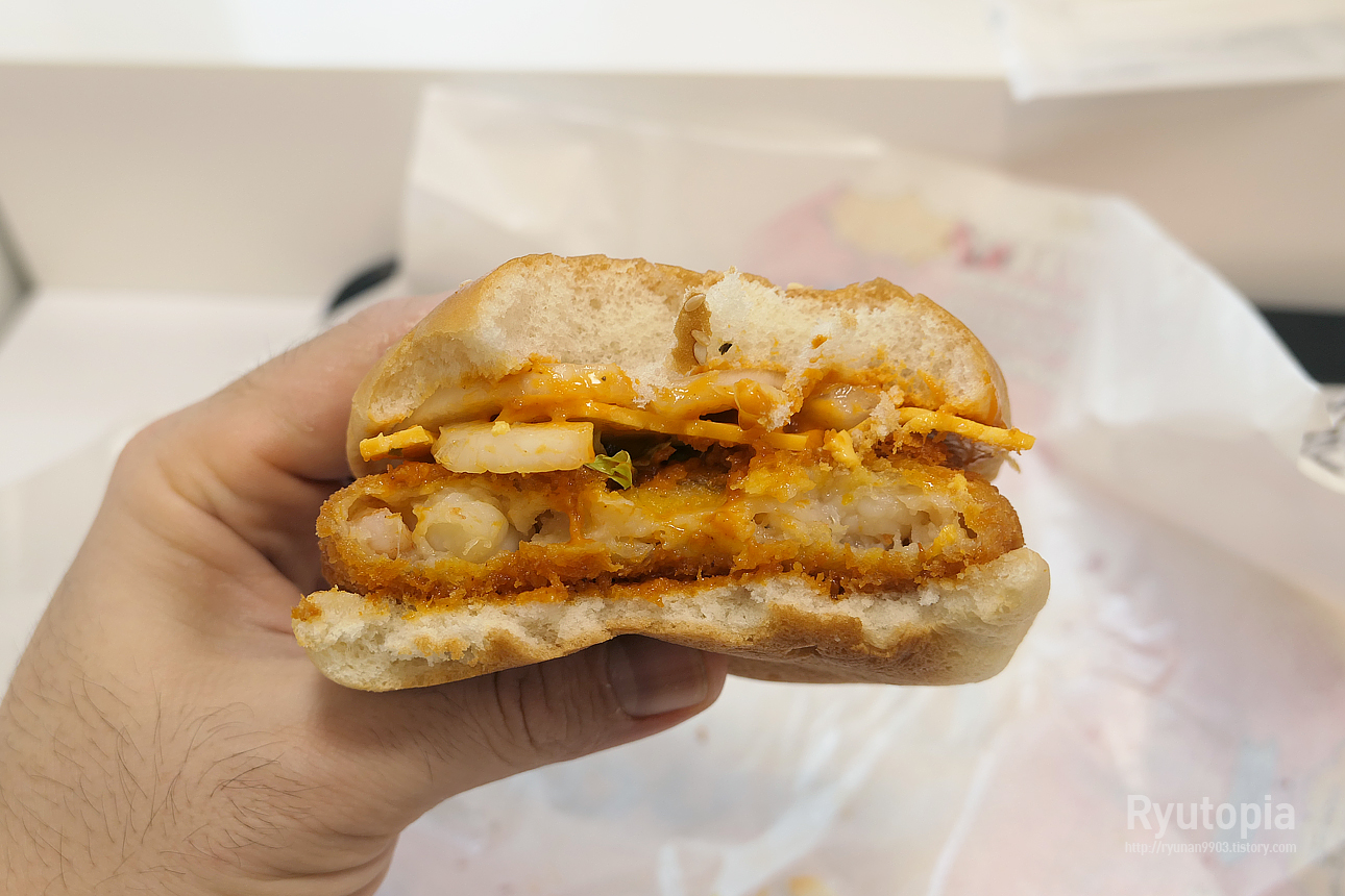 오, 새우패티 꽤 괜찮네요. 바삭한 튀김패티 속 잘 보면 탱글한 칵테일새우가 갈리지 않고 통째로 들어있어