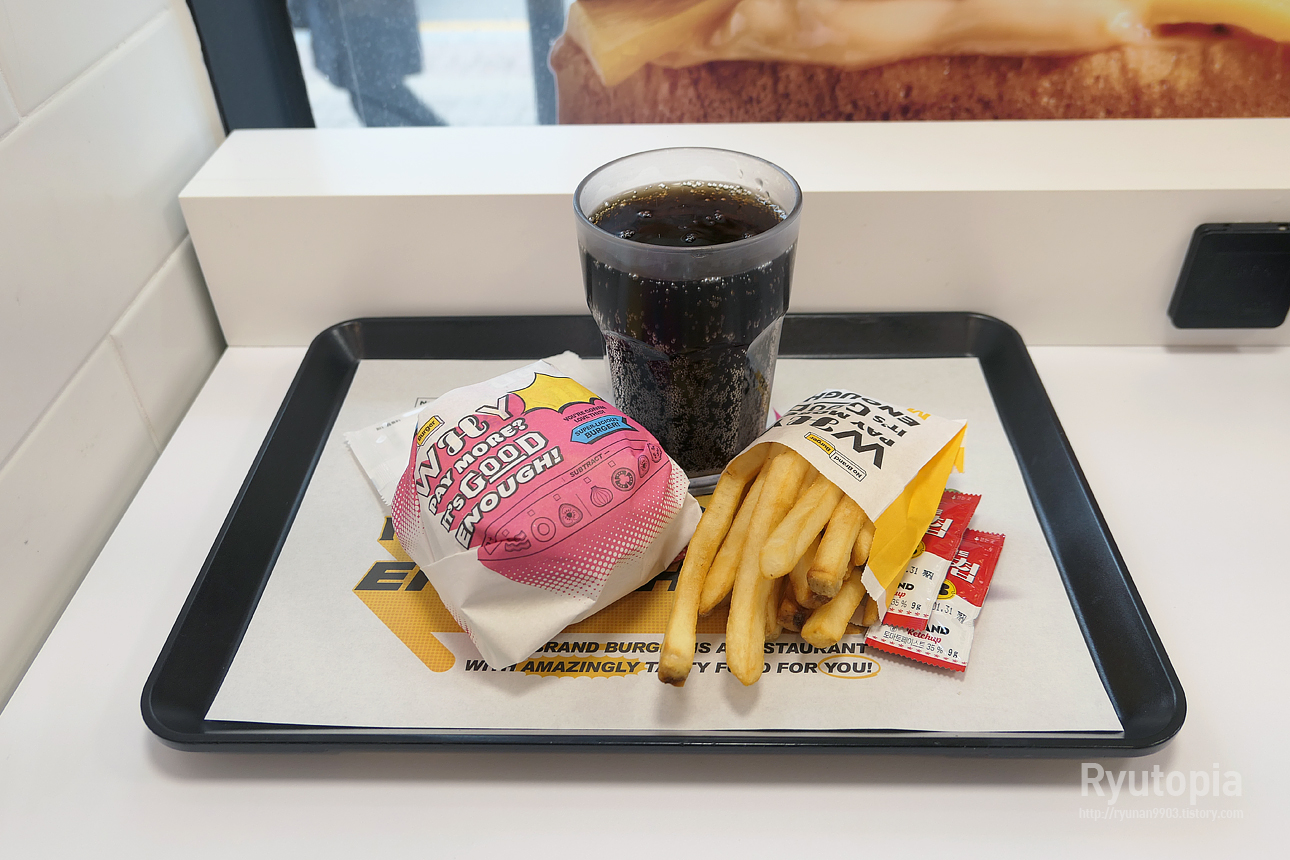 버거 포장은 분홍색 범용 포장지를 사용하고 있습니다. 별도로 제품 구분을 해 놓은 글씨는 따로 없군요.