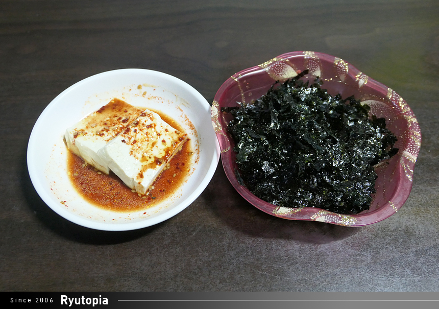 기본으로 나온 간장 끼얹은 찬 두부와 잘게 부순 김가루.