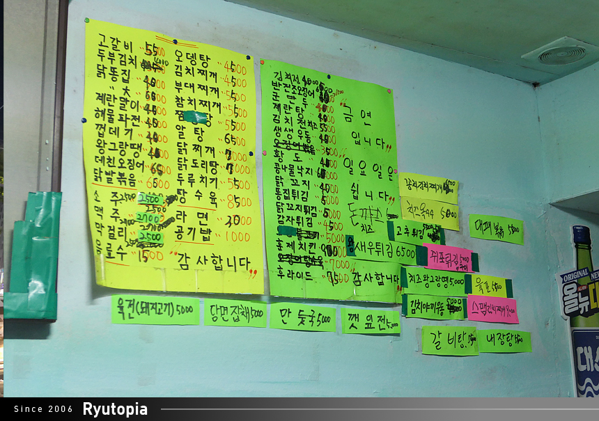 음식남녀의 메뉴판. 처음 메뉴판을 만든 뒤 수 없이 가격을 고친 흔적이 보이는 다소 난잡한 손글씨 메뉴판인데,