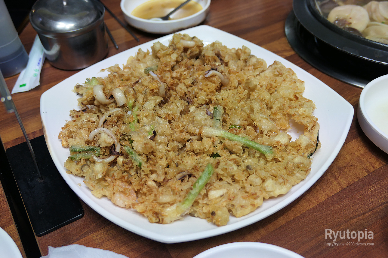 튀김처럼 튀겨 낸 바삭바삭한 맛의 파전이라고 보시면 될 듯. 사실 파전이라기보다는 야채튀김에 좀 더 가깝지만...