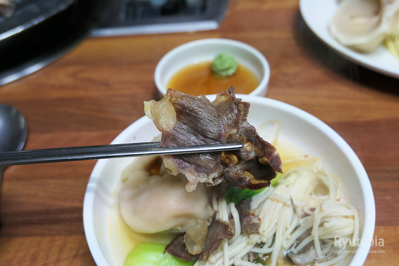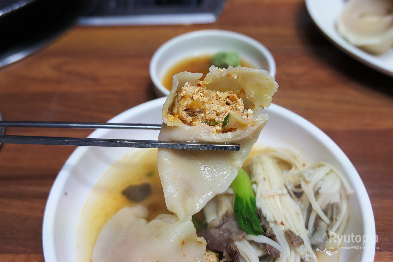 큼직한 만두, 그리고 버섯, 야채, 고기 등이 만들어내는 따끈따끈한 국물. 진짜 뭐랄까... 보기만 해도 건강해지는 느낌.