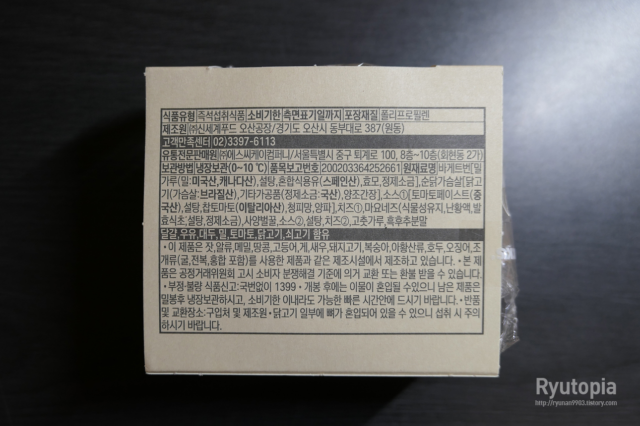 이 제품의 경우 토마토 소스와 다진 닭가슴살을 함께 넣은 샌드위치라고 하네요. 170g 한 개당 403kcal입니다.