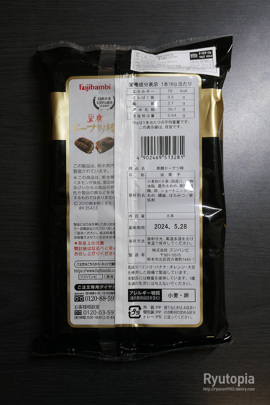 이 제품은 '후지밤비 흑당 도넛' 이라는 제품으로 흑설탕을 넣어 진한 단맛을 느낄 수 있는 촉촉한 올드패션 스타일의