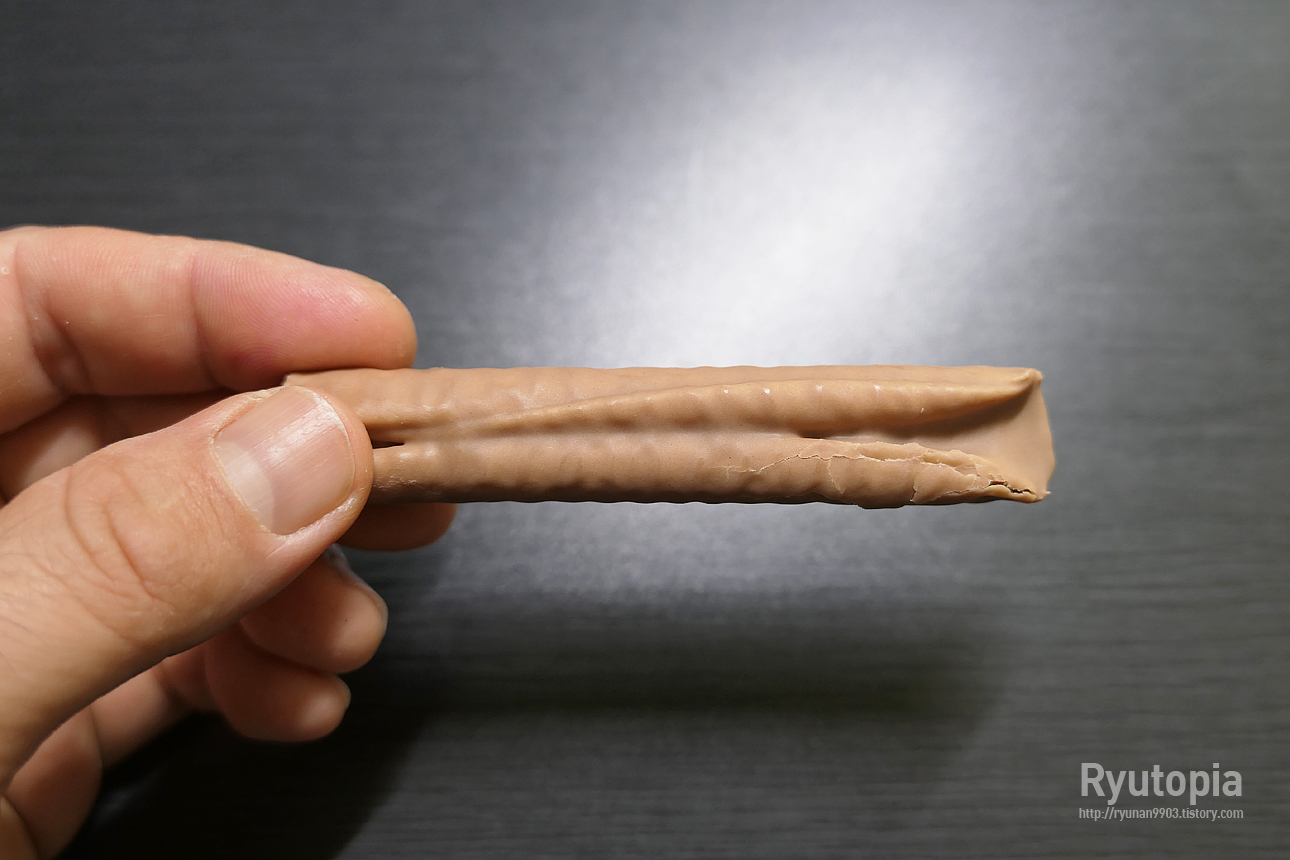 표면에 달콤한 크림이 코팅되어 있는 길쭉한 과자 속에 여러 겹 바삭바삭한 페스츄리 같은 얇은 질감의 과자가