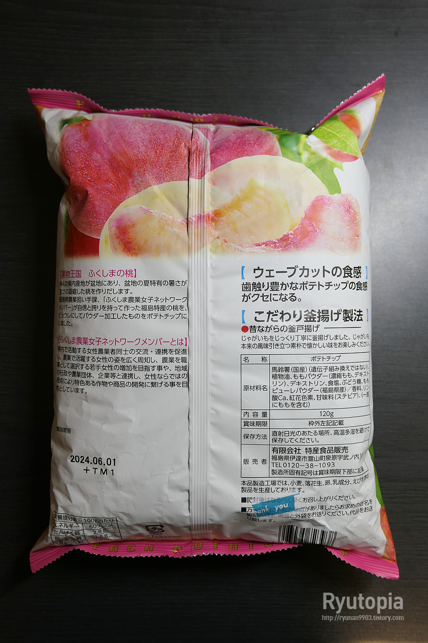 일본 후쿠시마산의 복숭아를 사용하여 만든 포테이토 칩이라고 합니다.