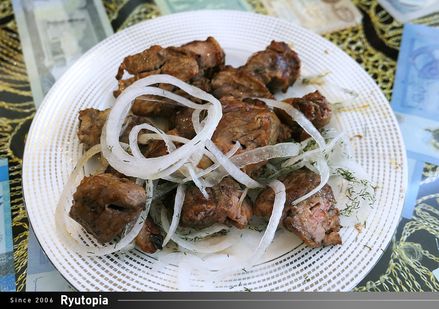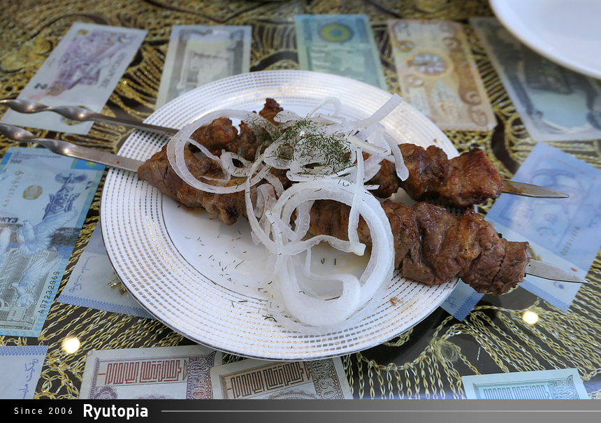 큼직한 양고기 꼬치 사이로 육즙을 볼 수 있습니다. 우즈베키스탄 식 양고기를 제대로 즐기고 싶을 때 꼭 추천하는 메뉴.