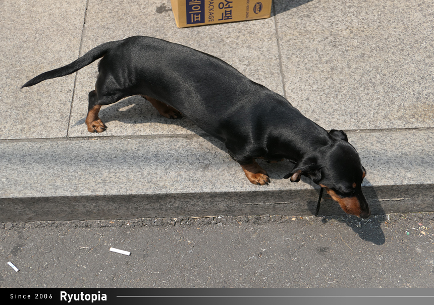 러시아케익 근처의 어떤 가게에서 일광욕 중인 닥스훈트.
