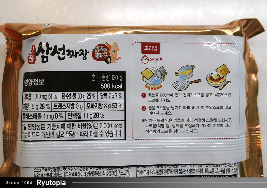 영양성분표 및 조리방법입니다. 한 봉지당 열량은 500kcal로 의외로? 다른 짜장라면들에 비해 낮은 편.