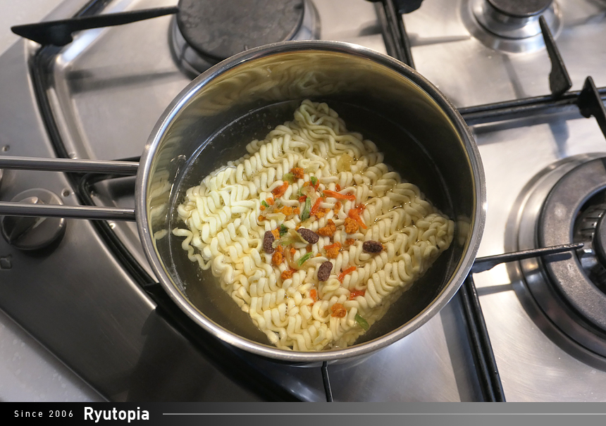 끓는물에 면과 건더기 후레이크를 넣은 뒤 약 4분 30초간 익힙니다.