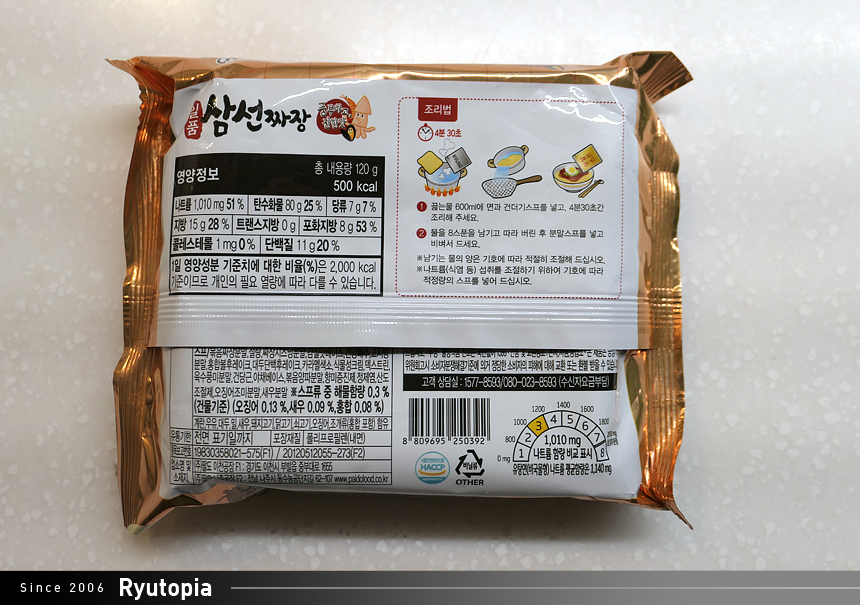 제품 포장 뒷부분입니다. 제품 컬러가 일반적인 짜장라면 색인 검정색이 아닌 짙은 금색인 것이 특징.