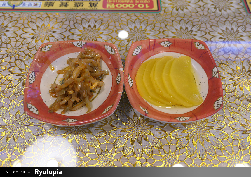 기본 찬으로 나온 짜사이와 단무지 두 가지.