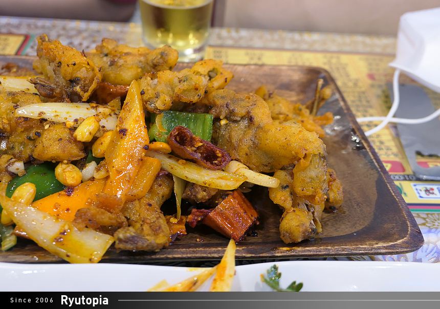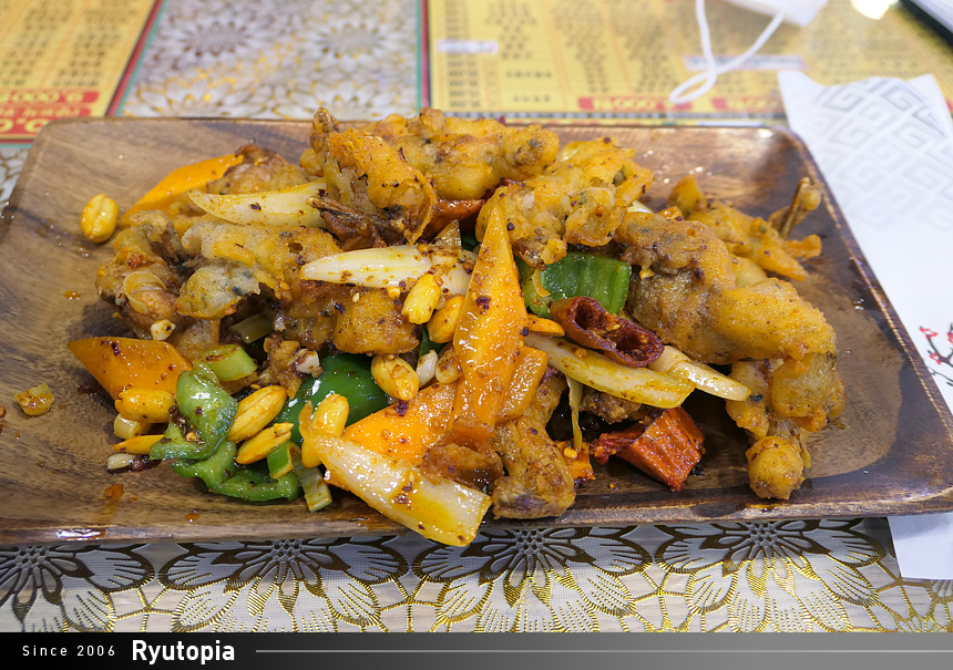 땅콩, 큼직하게 썬 야채 등과 함께 넣고 고추기름으로 매콤하게 볶아낸 요리입니다. 튀김이면서 볶음류에 가까운 요리.