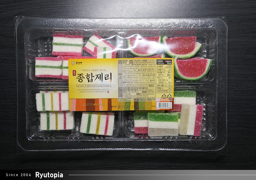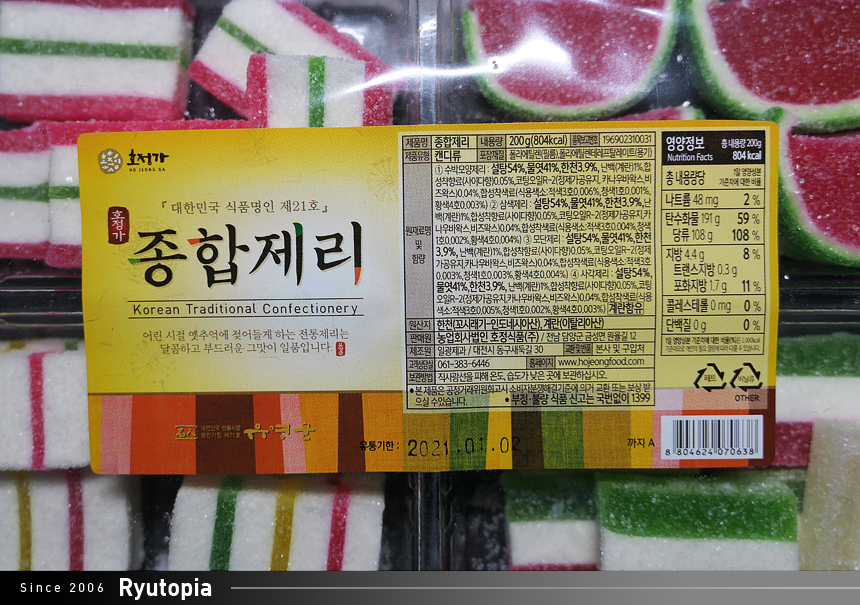 설탕과 물엿이 주 원료로 한천을 이용해 굳힌 거라 열량이 어마어마합니다(...) 200g에 무려 800kcal...!!