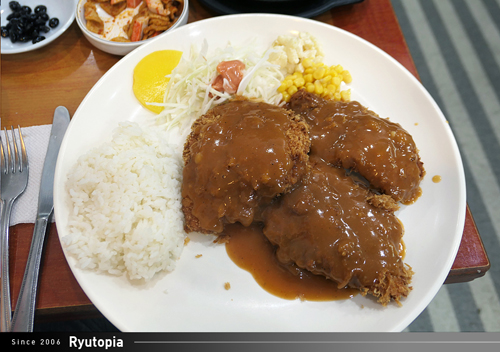 커다란 접시에 돈까스와 함께 각종 사이드 메뉴, 그리고 밥이 한데 담겨나오는 한국식으로 어레인지한 경양식 돈까스입니다.