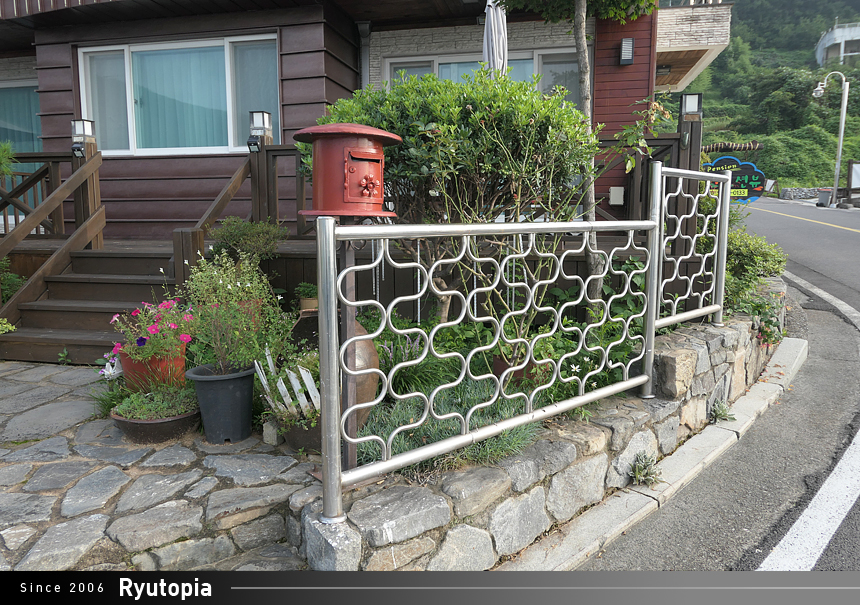 펜션 발코니로 올라가는 계단 입구에 심어져 있는 수많은 꽃화분.