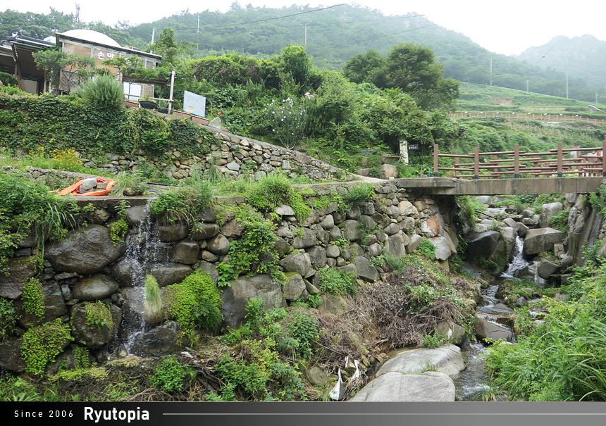 마을의 중앙을 흐르는 개천의 둑은 사진과 같이 돌을 하나하나 쌓아 만들어 놓았습니다.