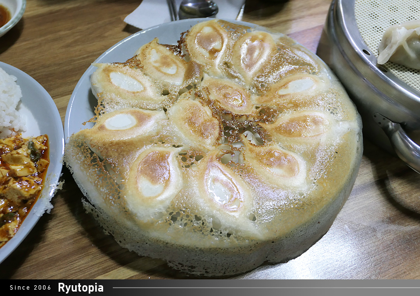 팬 바닥에 녹말풀을 깐 뒤 지져 구워낸 만두로 총 12개의 한 입 크기 만두가 접시에 담겨 나옵니다.