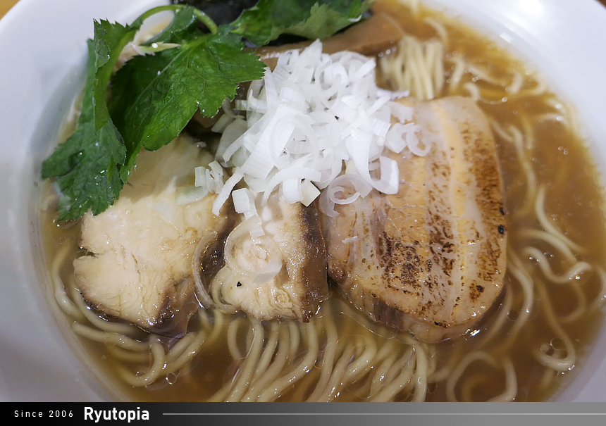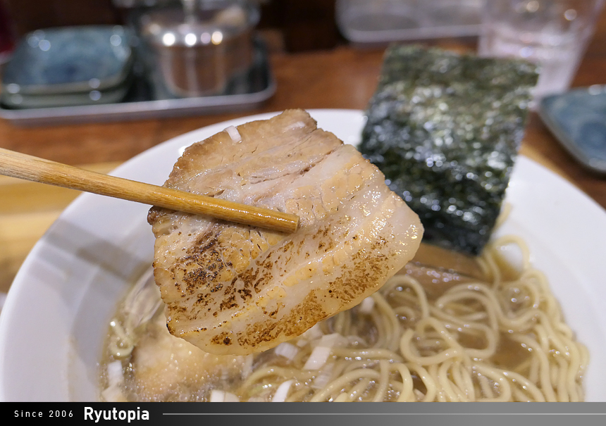 불에 표면을 살짝 구운 돼지고기 차슈와 함께 수비드 공법으로 익힌 닭고기 고명 두 점이 얹어져 있습니다.