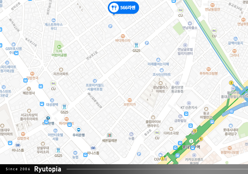 ※ 566라멘 찾아가는 길 : 지하철 2, 경의중앙, 공항철도 홍대입구역 2번출구 하차, 연남동 방향을 따라 쭉 북쪽으로 직진