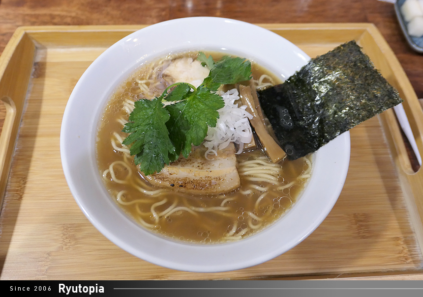 직접 뽑은 면이 상당히 굵은 편이고 그 위에 고명으로 멘마와 불에 구운 두꺼운 챠슈, 조림계란, 구운 김 한 장이 제공.