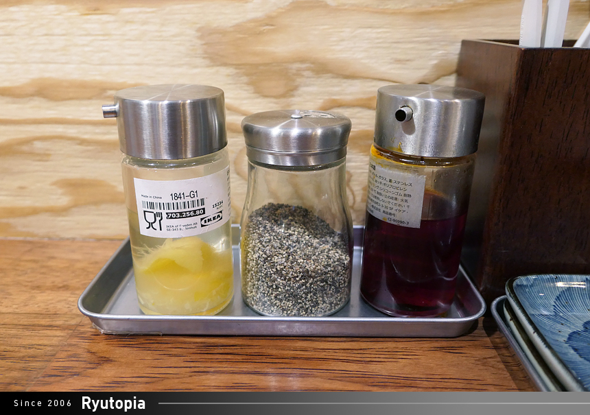 이케아제(^^;;) 양념통에는 후추와 고추기름, 그리고 왼쪽은 식초였나... 왼쪽 건 기억이 나지 않는군요.