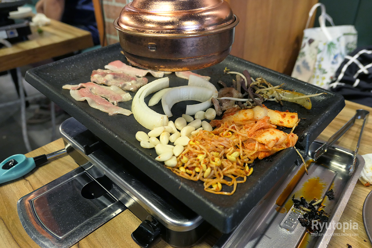 처음에 고기만 잔뜩 구워 일단 입에 기름칠을 하여 달랜 뒤 이후 양파, 마늘 등도 올려 느긋하게 굽기 시작.