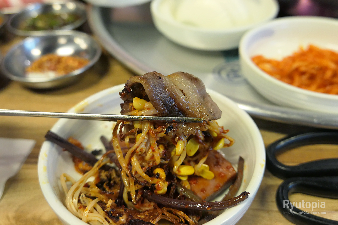 고기 기름 내려오는 바닥쪽에 팽이버섯, 숙주나물, 고사리, 배추김치, 콩나물 등 올려놓고 열심히 구웠습니다.