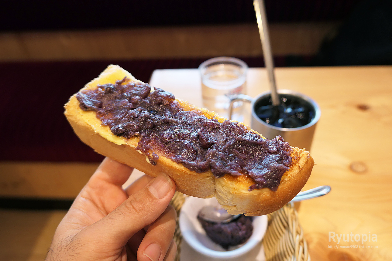 버터를 발라 두툼하게 구운 토스트빵 위에 단팥을 듬뿍 발라서... 두툼하게 한 입 앙~!!