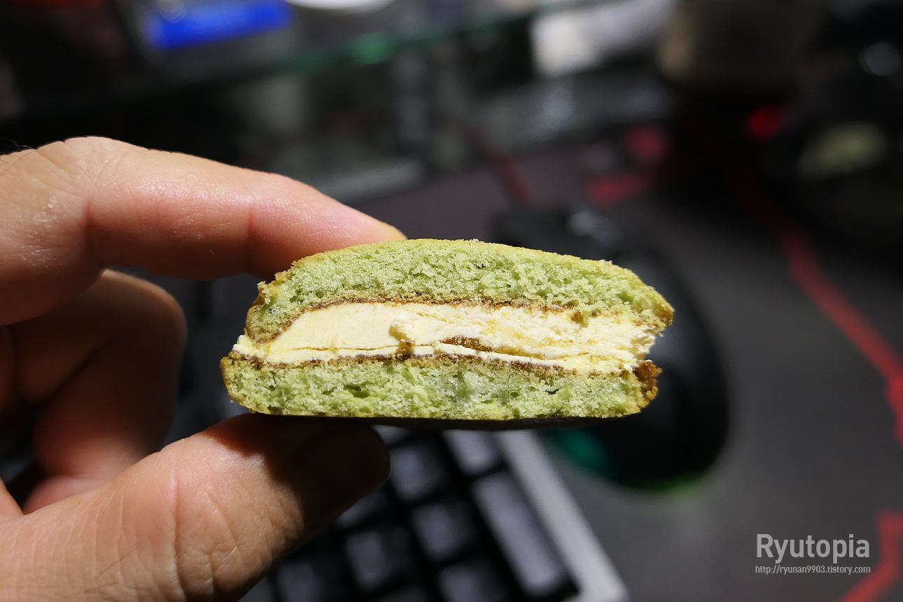 안에는 이렇게 멜론 크림이 꽤 두껍게 샌드되어 있습니다. 초코파이 류의 다른 파이와 비교해도 확연히 차이가 나는 풍부한 크림.