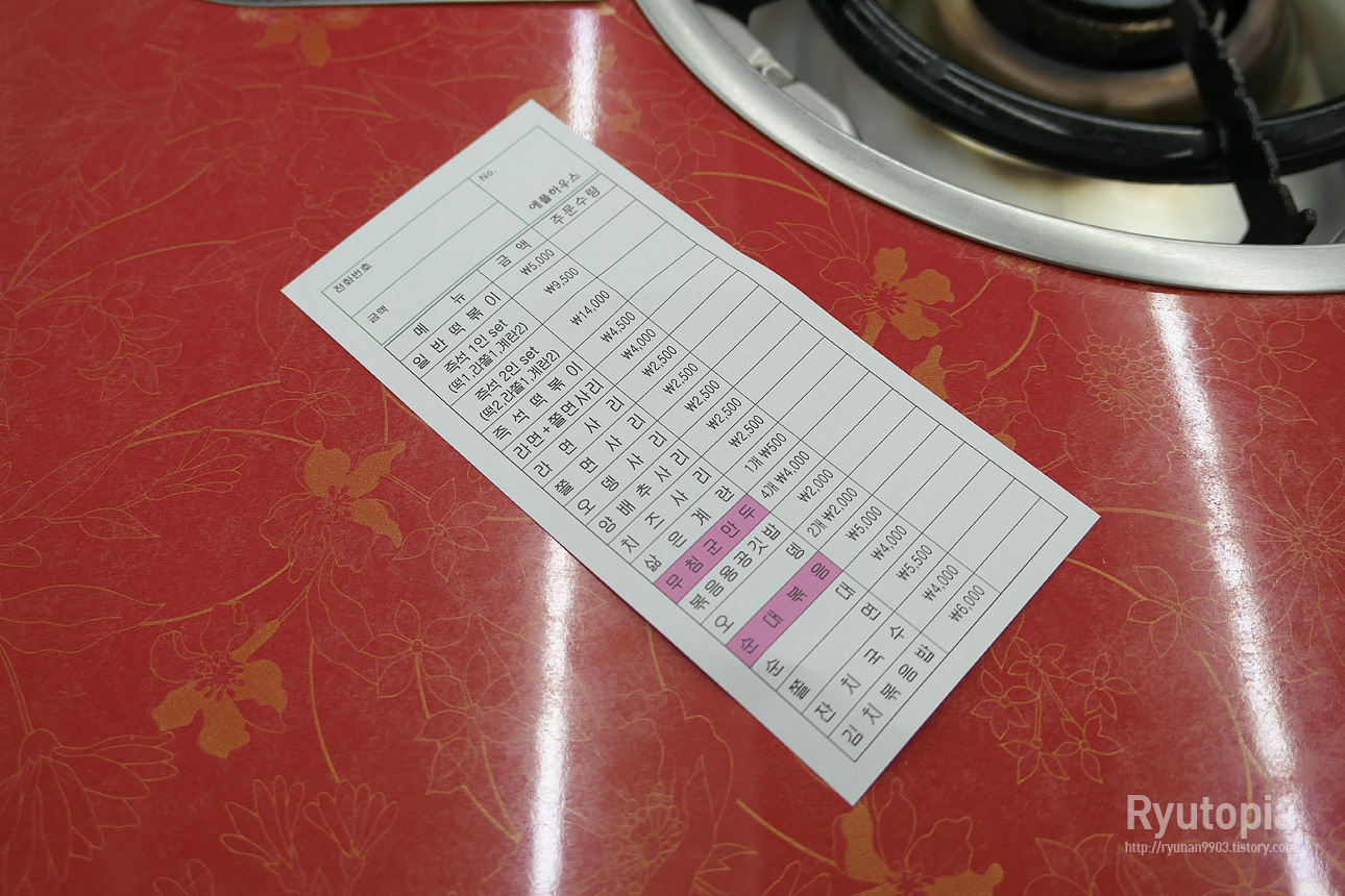 메뉴판은 주문서 영수증으로 대체합니다. 이 가게의 대표 간판메뉴는 무침군만두. 다른 건 몰라도 저건 무조건 시켜야 하지요.