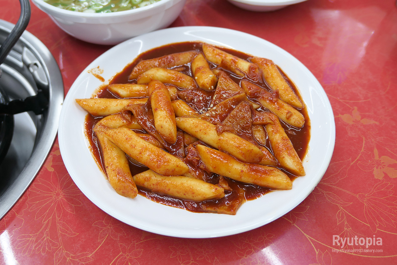 넓은 접시에 일반적인 1인분 떡볶이보다는 살짝 더 많은 양의 떡볶이가 넉넉하게 담겨나오는데 어묵과 함께 볶아낸 것이 특징.