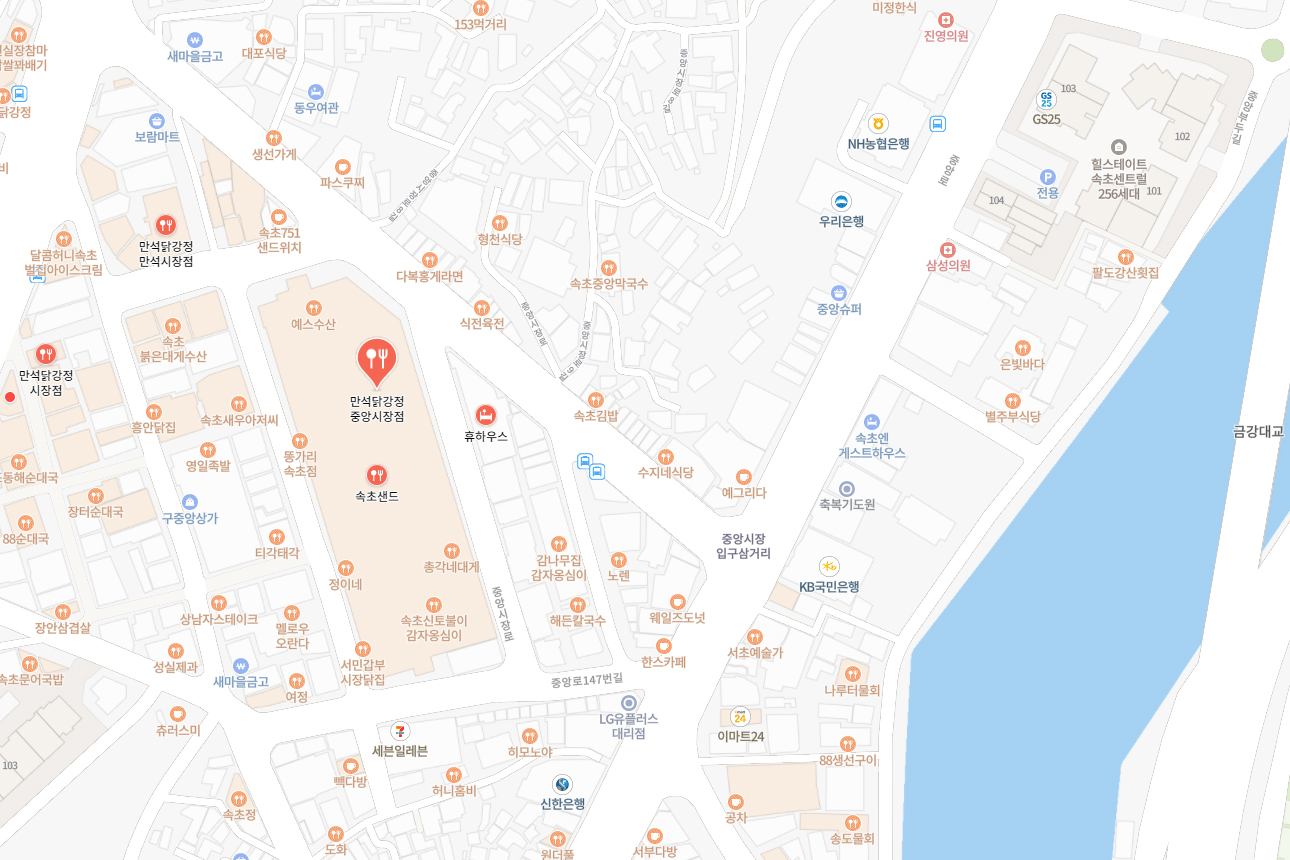 ※ 만석닭강정 중앙시장점 찾아가는 길 : 강원특별자치도 속초시 중앙로147번길 16(중앙동 471-4), 속초관광수산시장 닭전골목내