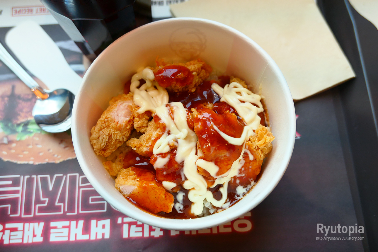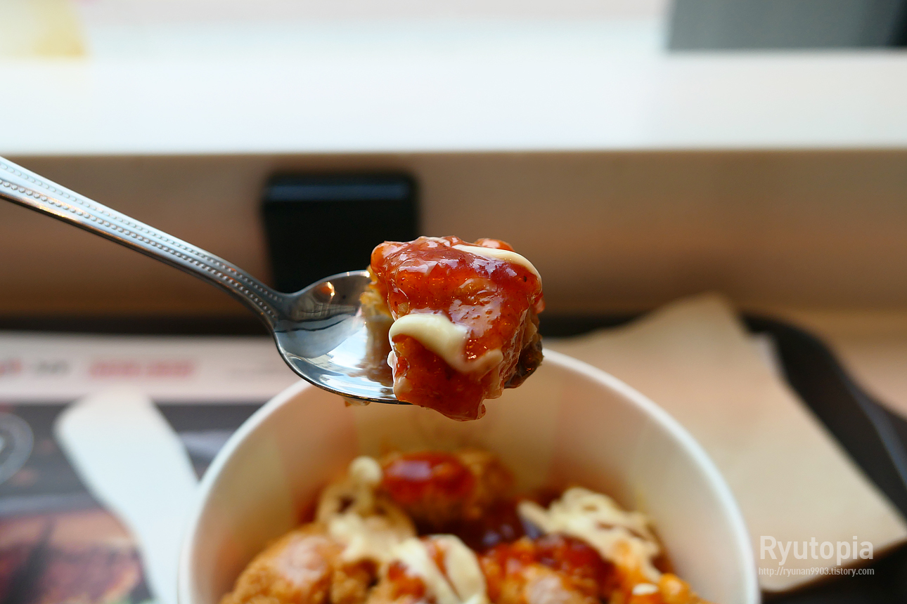 치킨은 그냥 KFC 치킨텐더 맛. 그리고 갓양념 소스는 그냥 단맛 강한 양념치킨 소스라고 보시면 됩니다.