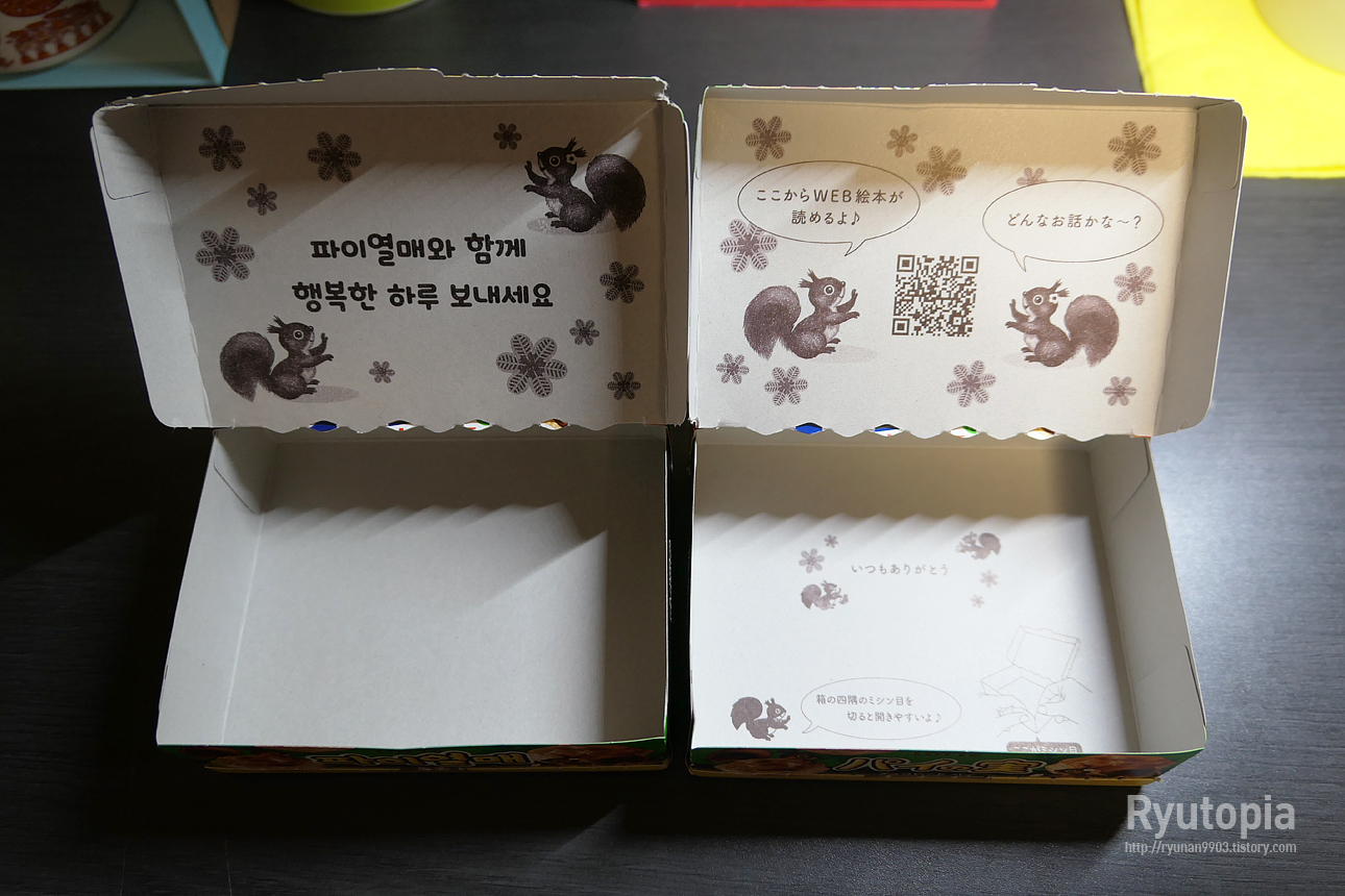 대한민국 포장은 QR코드가 없는 대신 '파이열매와 함께 행복한 하루 보내세요' 라는 문구가 인쇄되어 있습니다.