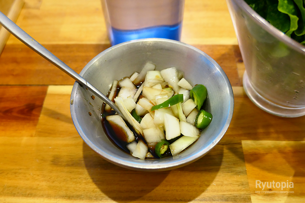쌈에 싸 먹는 양념장으로 양파간장이 나오는데, 1인분 치고 꽤 많은 양의 양파간장이 나옴.