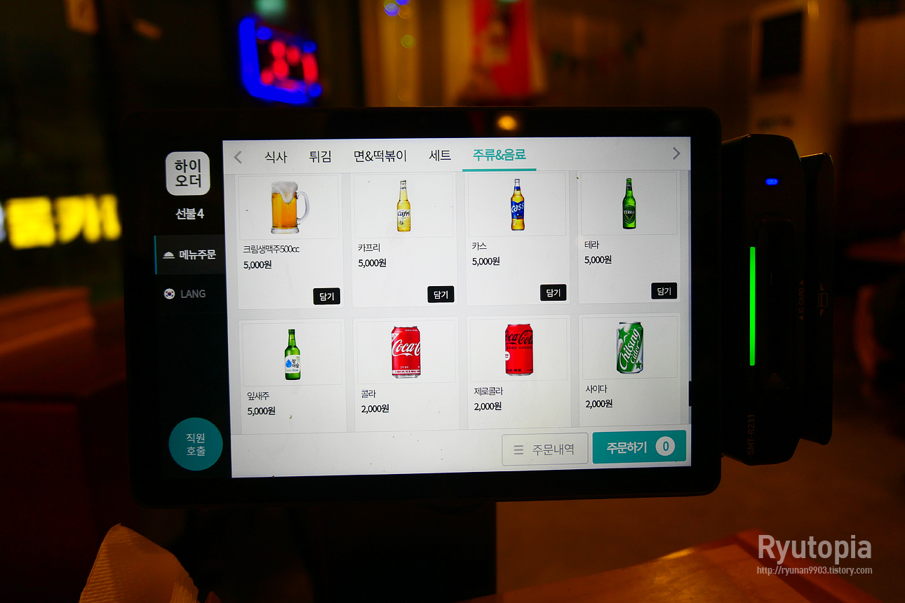 테이블마다 태블릿 모니터가 설치되어 있어 직접 주문을 할 수 있고 카드 단말기가 달려 있어 선결제로 주문이 가능하다.