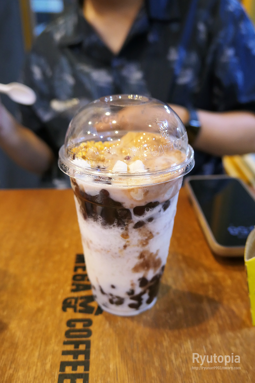이거 엄청 묵직해요. 메가커피의 커다란 컵 안에 액체가 아닌 갈은 얼음과 단팥 등의 밀도 높은 재료들로 가득 채웠으니