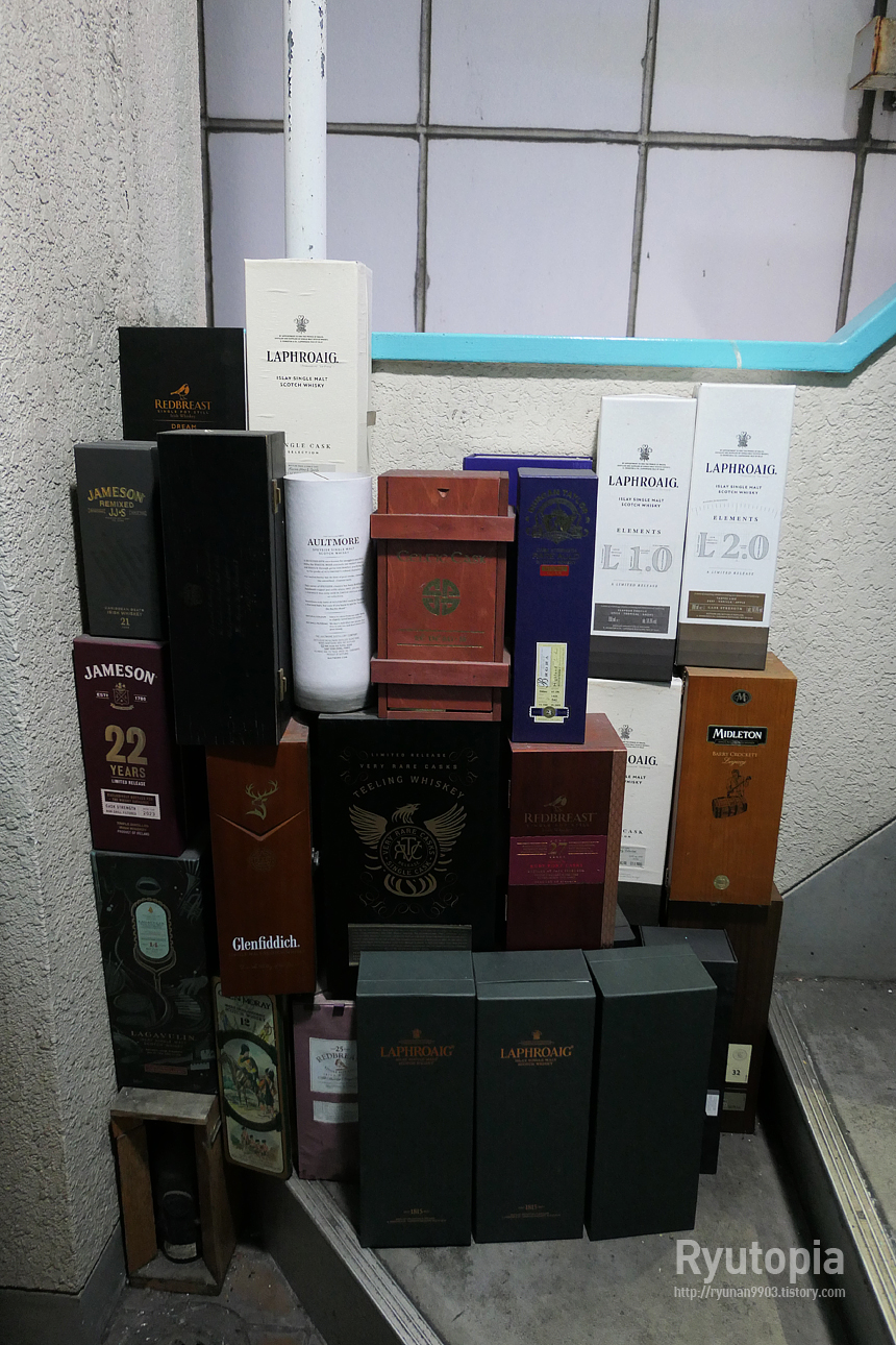 가게 앞 계단에 쌓여있는 위스키 박스들.