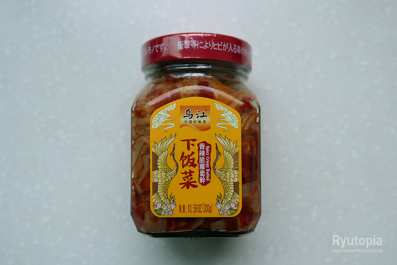 병조림 형태로 되어있으며 포장에는 금색 털의 두루미가 그려져 있는 '하반채(下饭菜)' 글씨가 인쇄되어 있습니다.